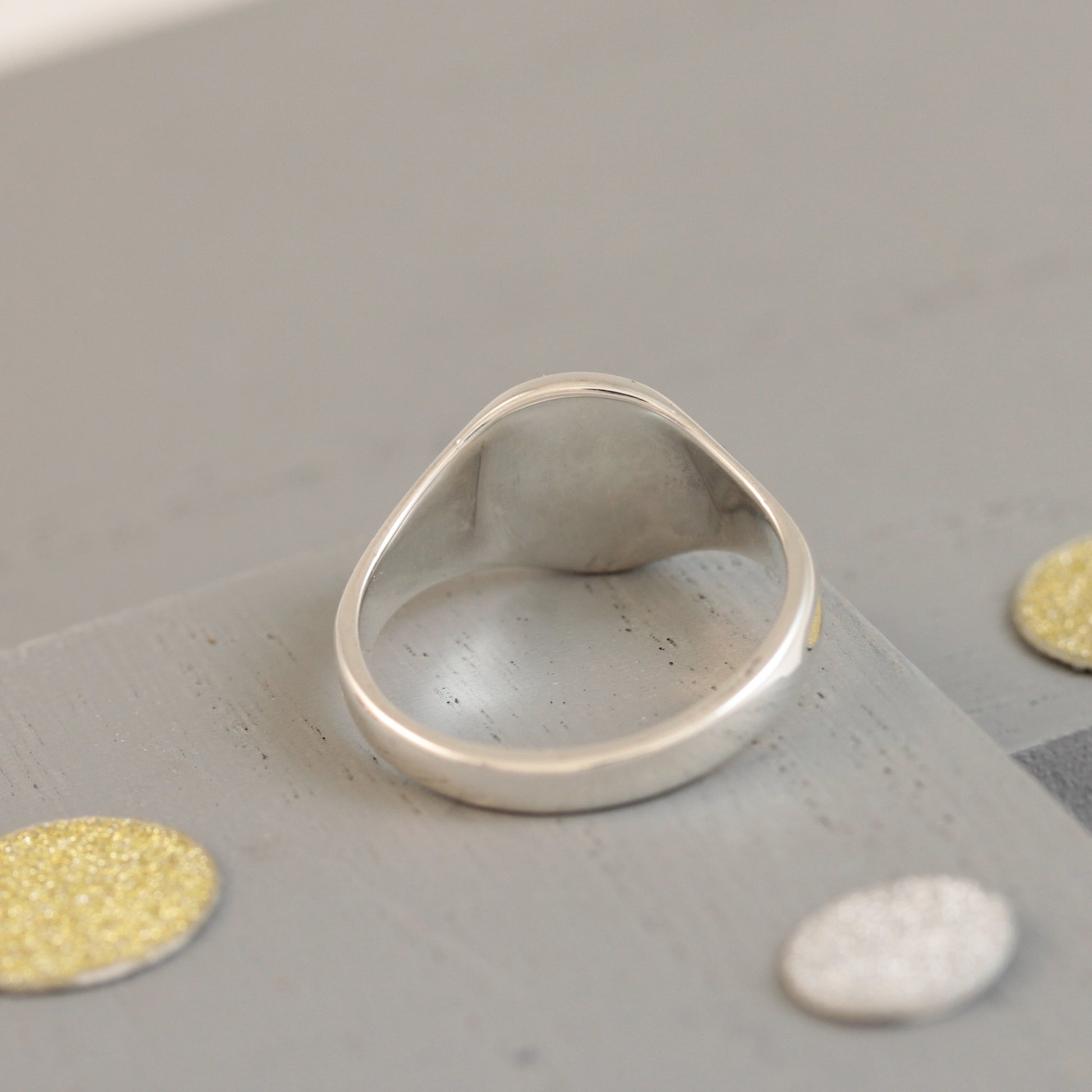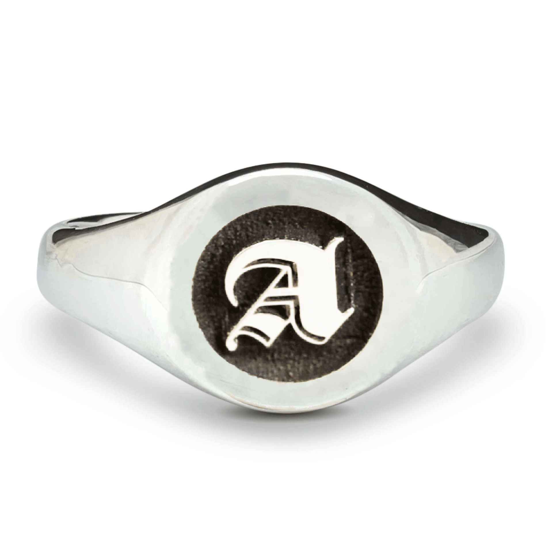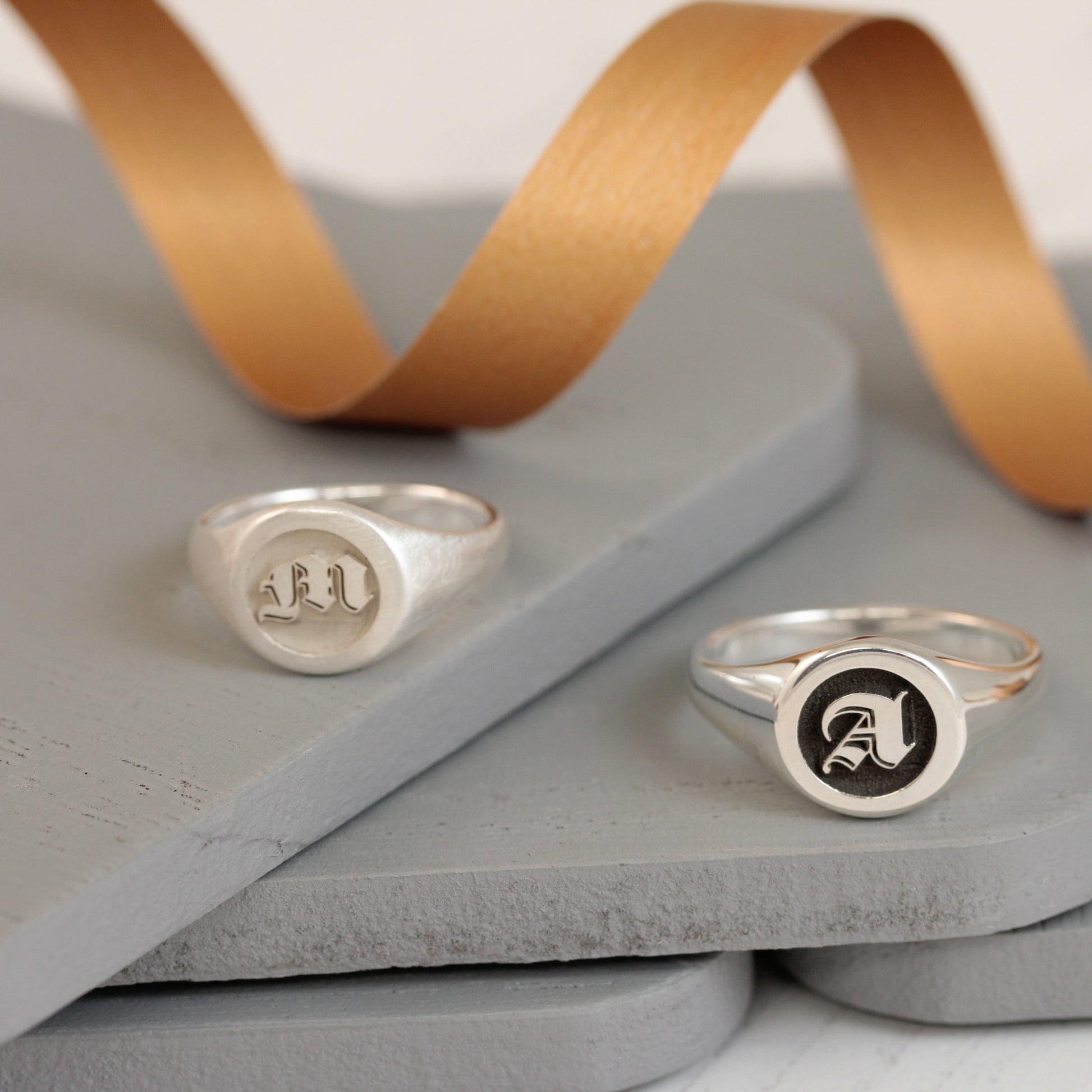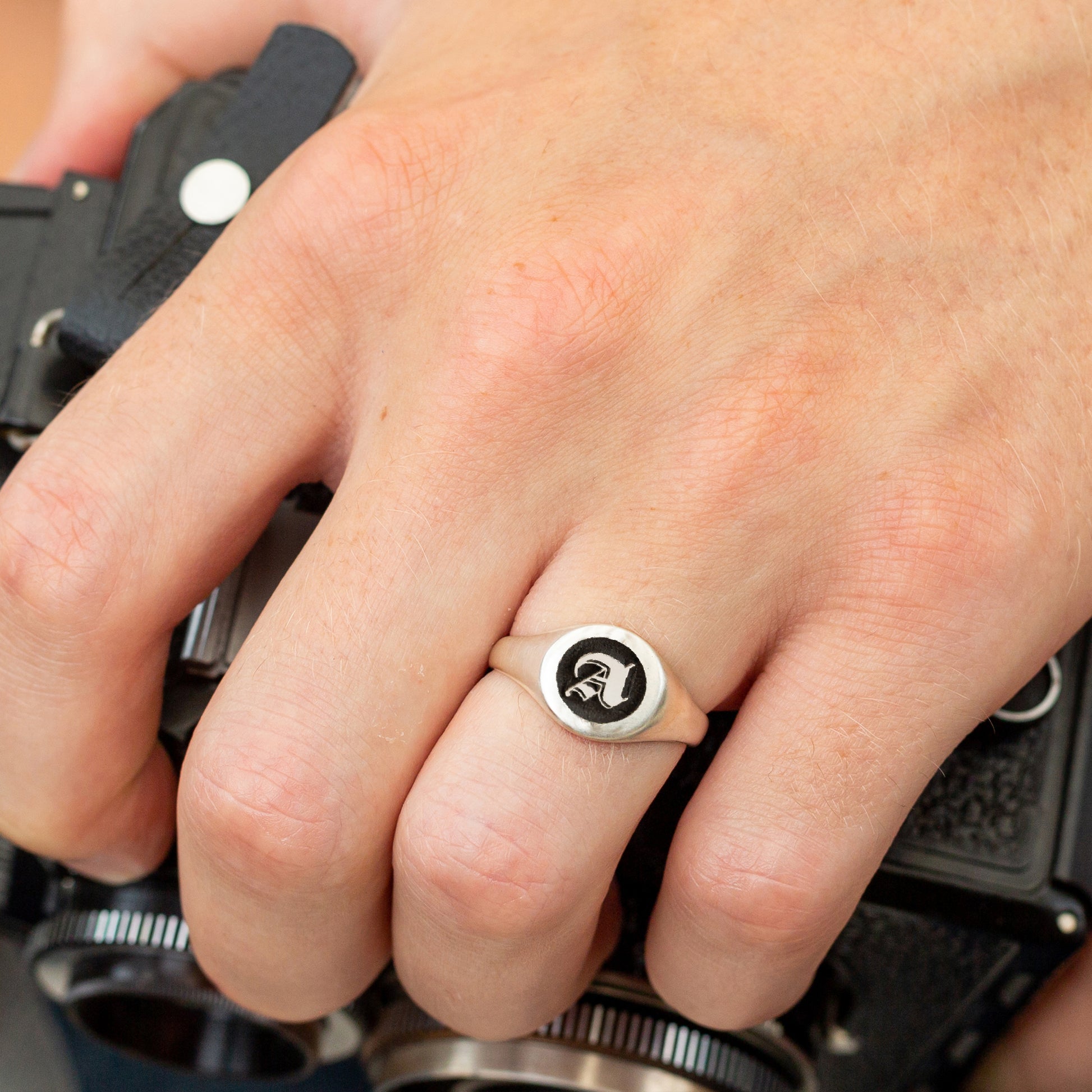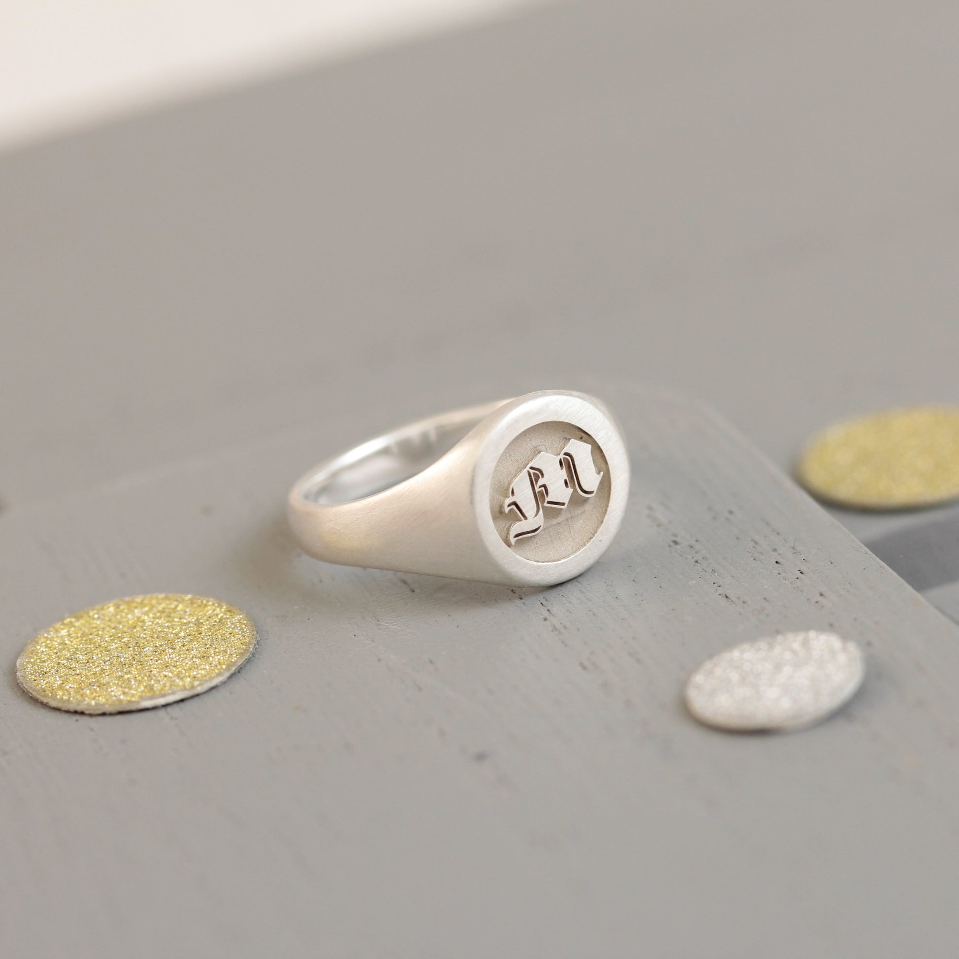 A unique silver signet ring deeply custom engraved with your own bold gothic style initial.