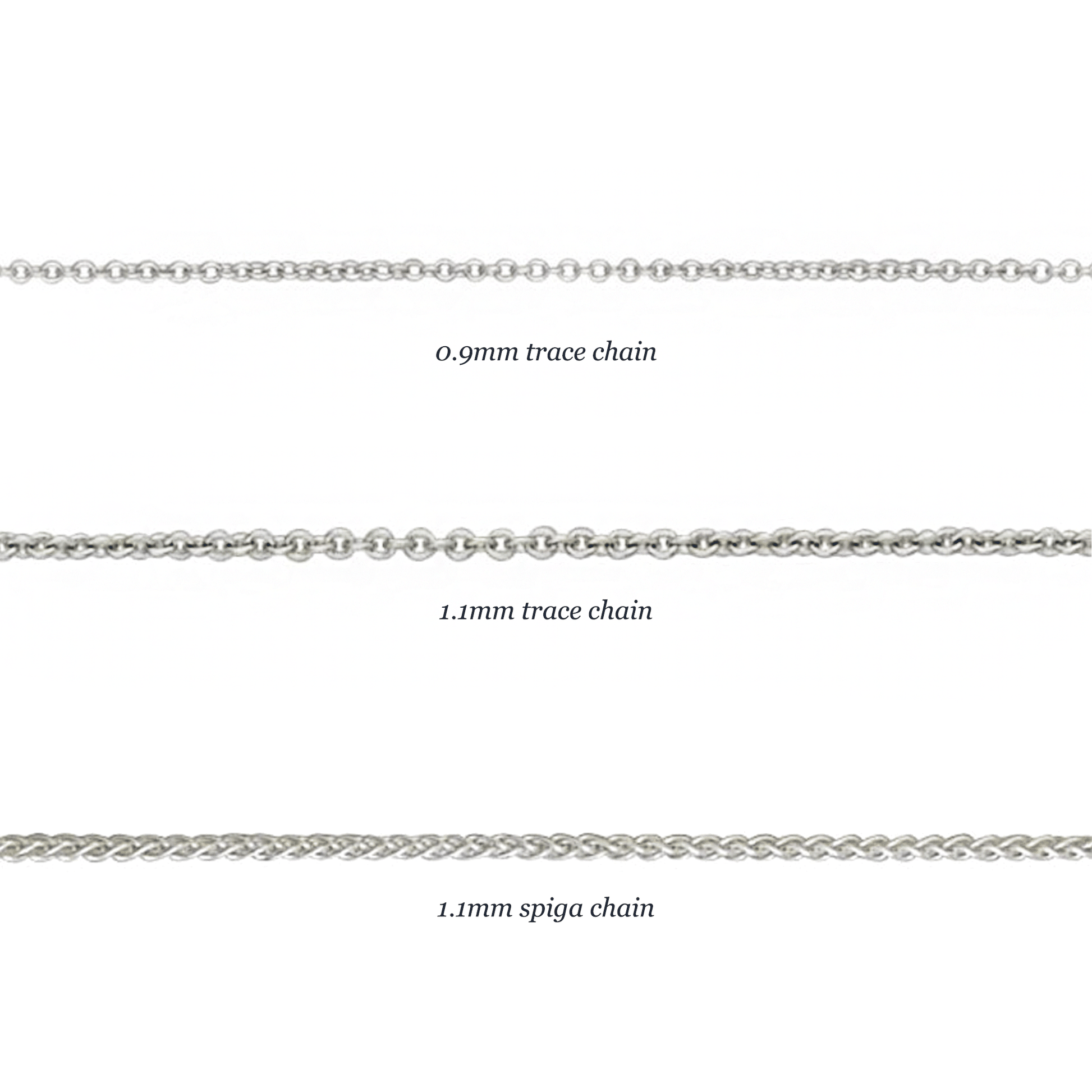 Includes 0.9mm trace chain (as shown in main image). The model photographs features our elegant 1.1mm trace or spiga chain options for those who prefer additional weight. All chains are crafted in the UK from solid sterling silver and feature a secure lobster clasp.