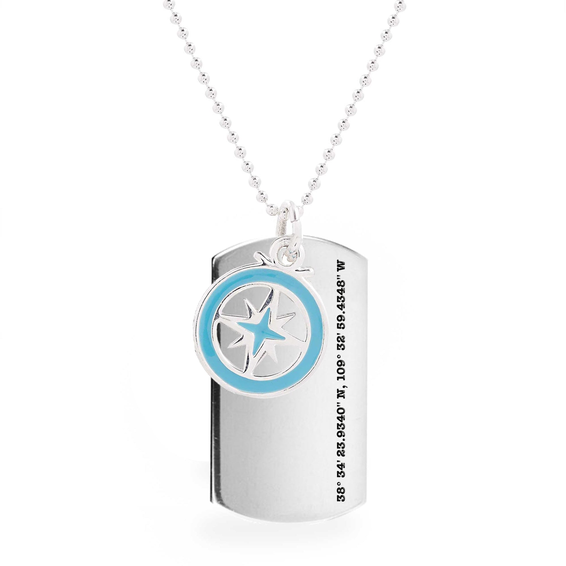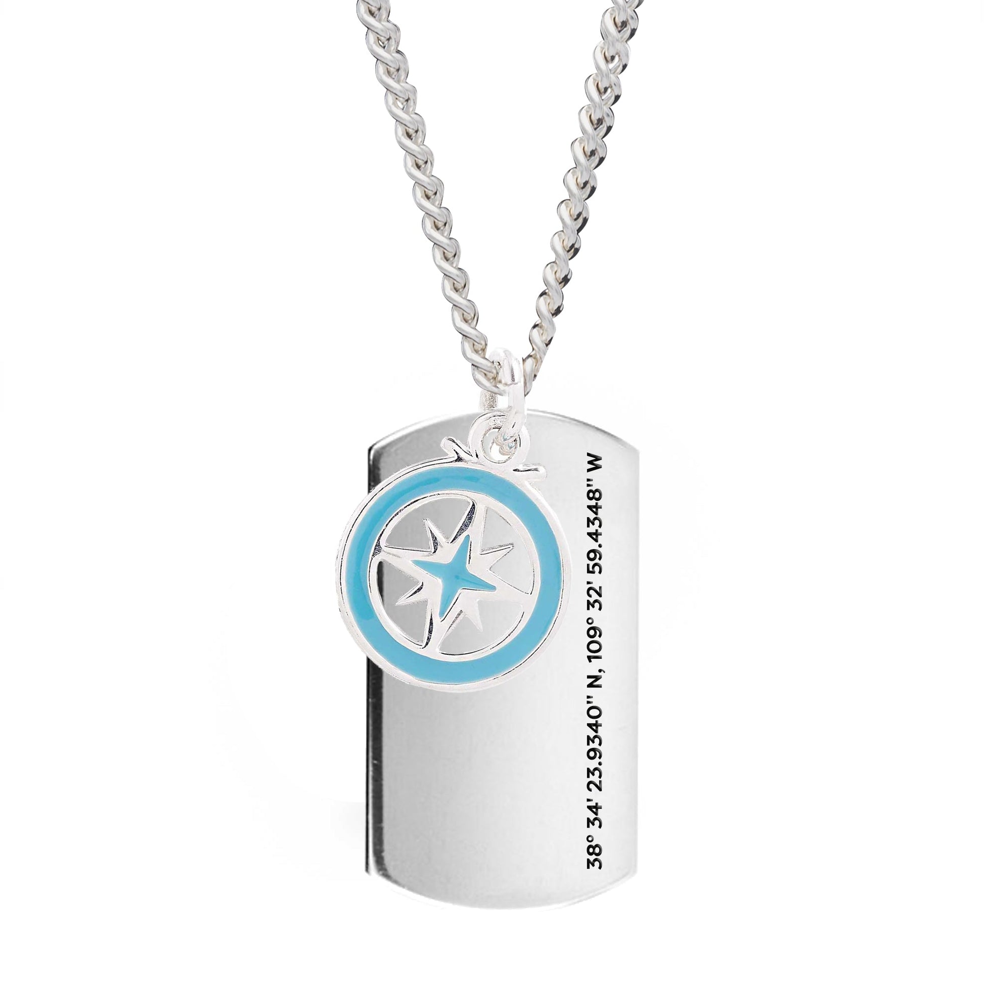 Upgrade your style with a one-of-a-kind X-L Recycled Silver Dog Tag Necklace with a beautiful enamel compass accent! Crafted from heavy recycled silver, it features coordinates engraved on the front and your custom message engraved on the back. Wear it with confidence and make a bold statement!