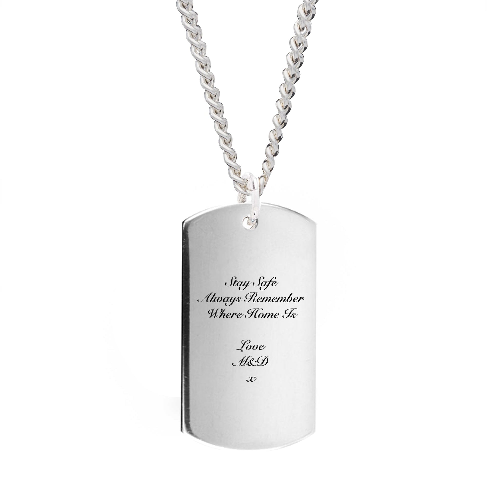This chunky 100% recycled silver dog tag pendant is engraved with your coordinates and can also be engraved on the back. The dog tag is given a high polished finish.