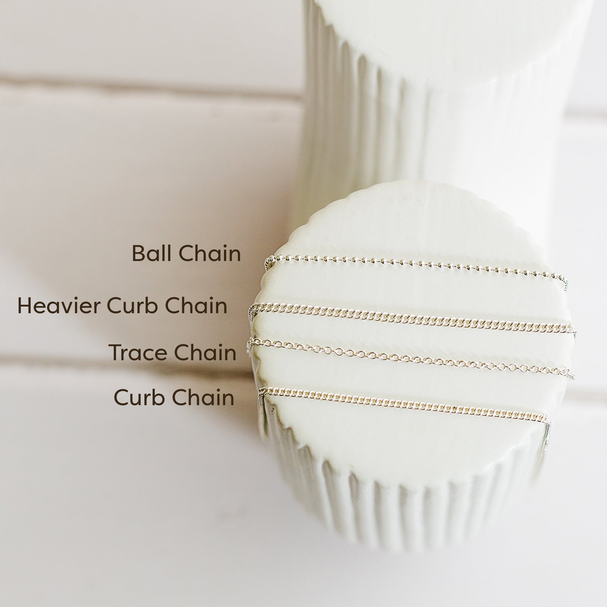 Solid silver trace, ball and curb chains measure 1.1mm thick and come in a choice of chain lengths. Heavier curb chains measure 2.1mm thick.