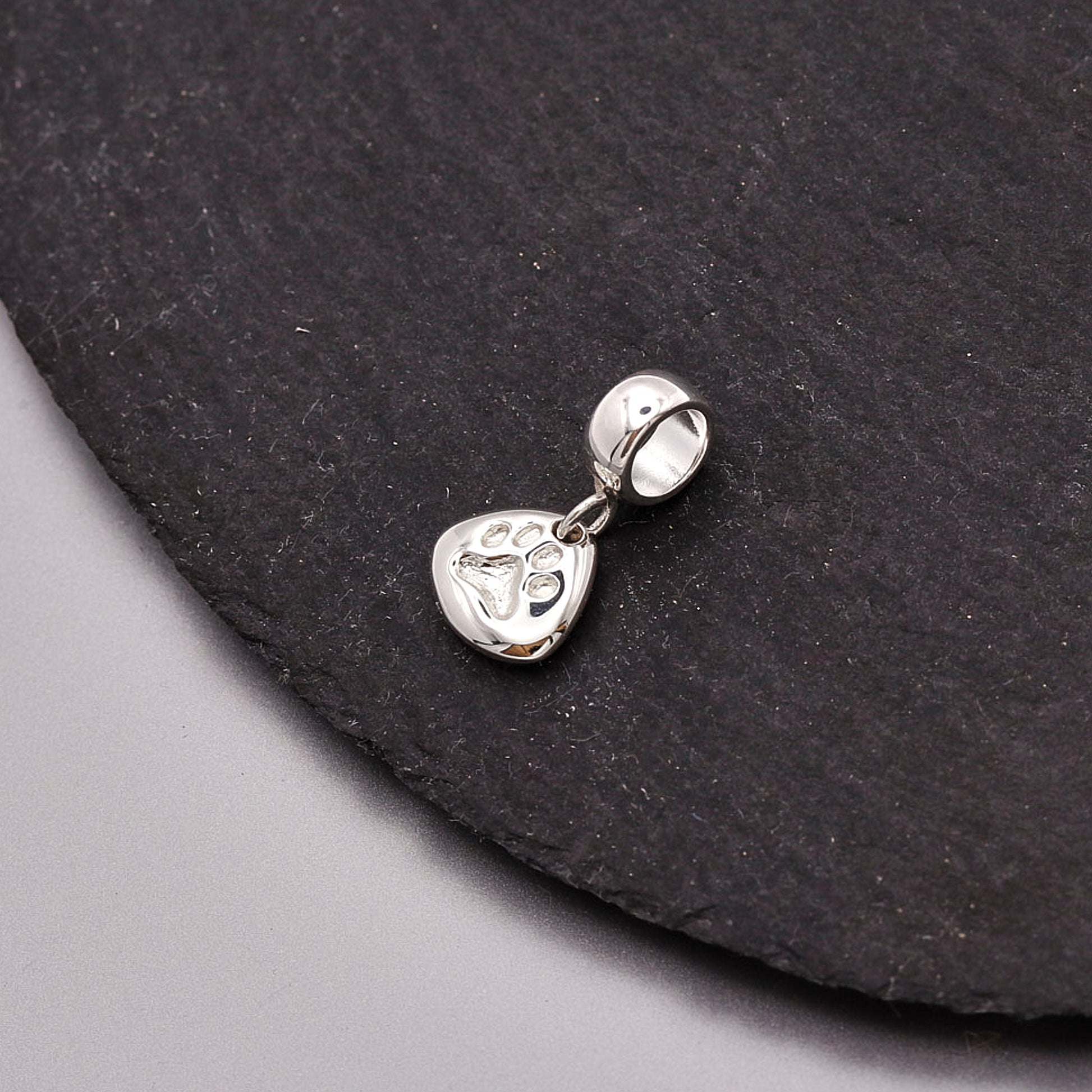 Carry a cherished reminder of your furry friend wherever you go with this exquisite Solid Silver Paw Print Charm. Featuring a softly rounded design and a paw print symbol indented on the front and the option to engrave a name on the back, this charm offers a beautiful way to keep your pet close.