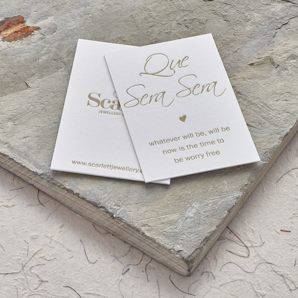 The necklace features a free-moving worry bead adorned with the timeless mantra "Que sera sera." This gentle reminder to let go and embrace life's uncertainties can provide a sense of calm and serenity.