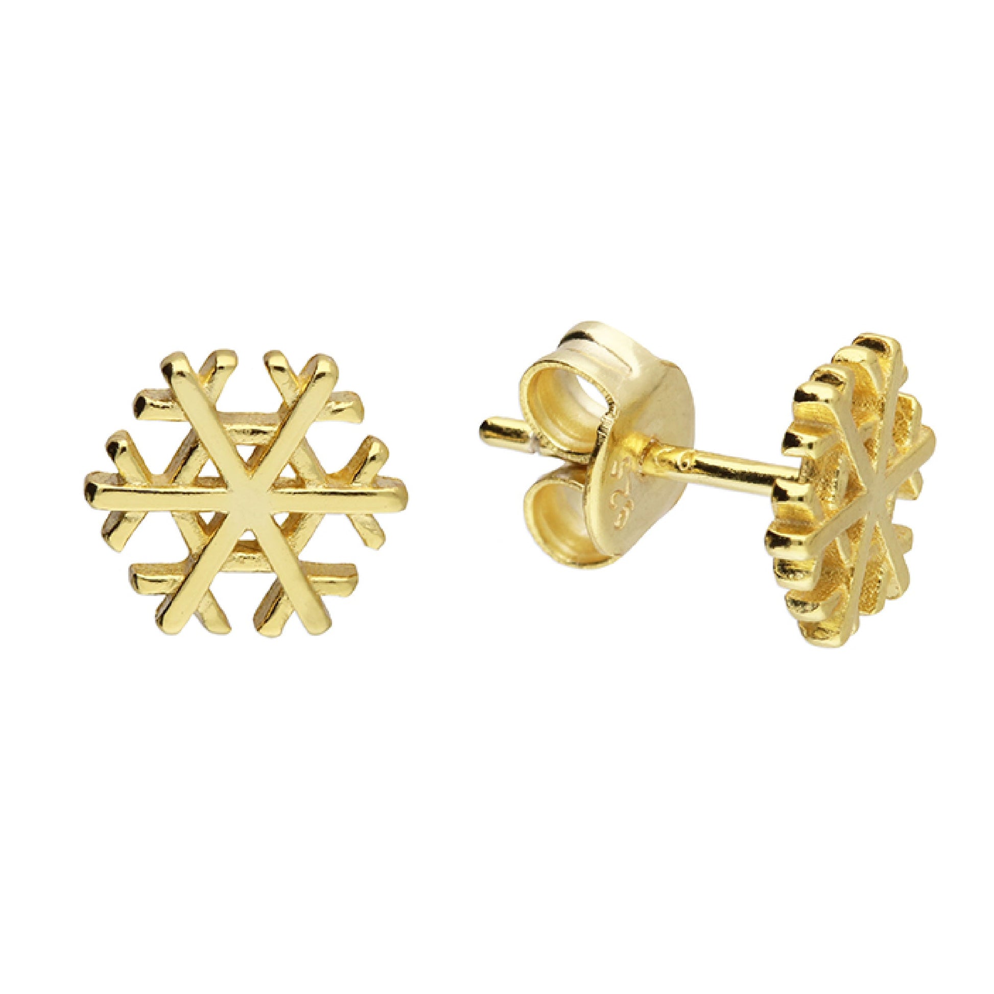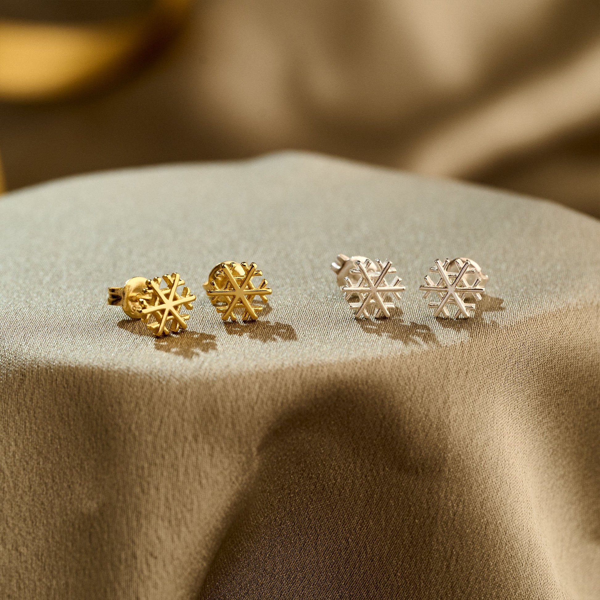 Our Gold-Plated Silver Snowflake Stud Earrings capture the delicate beauty of falling snow. These exquisite earrings feature a finely polished snowflake design, crafted from high-quality sterling silver and plated with a shimmering layer of gold. The classic butterfly earring backs ensure a comfortable and secure fit.