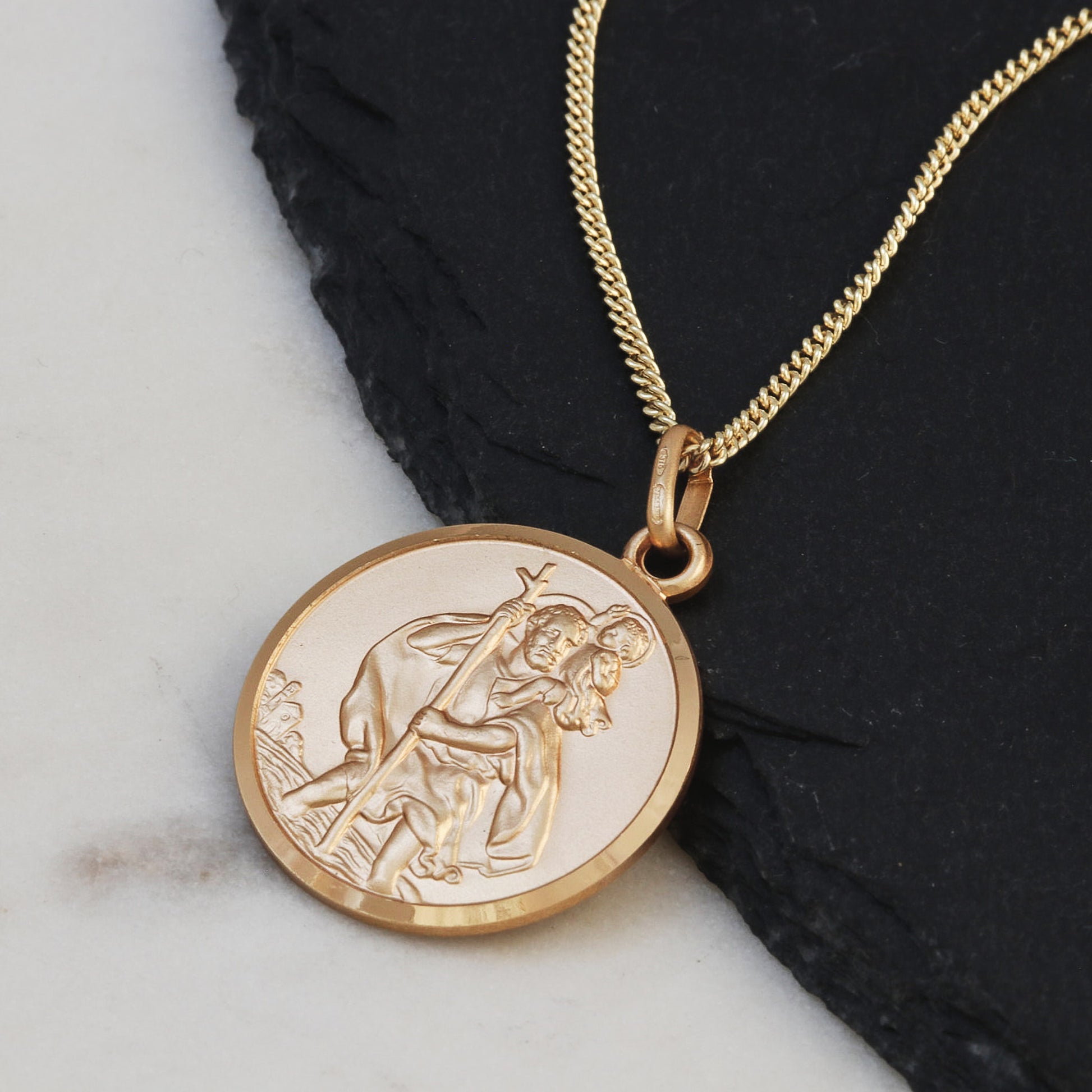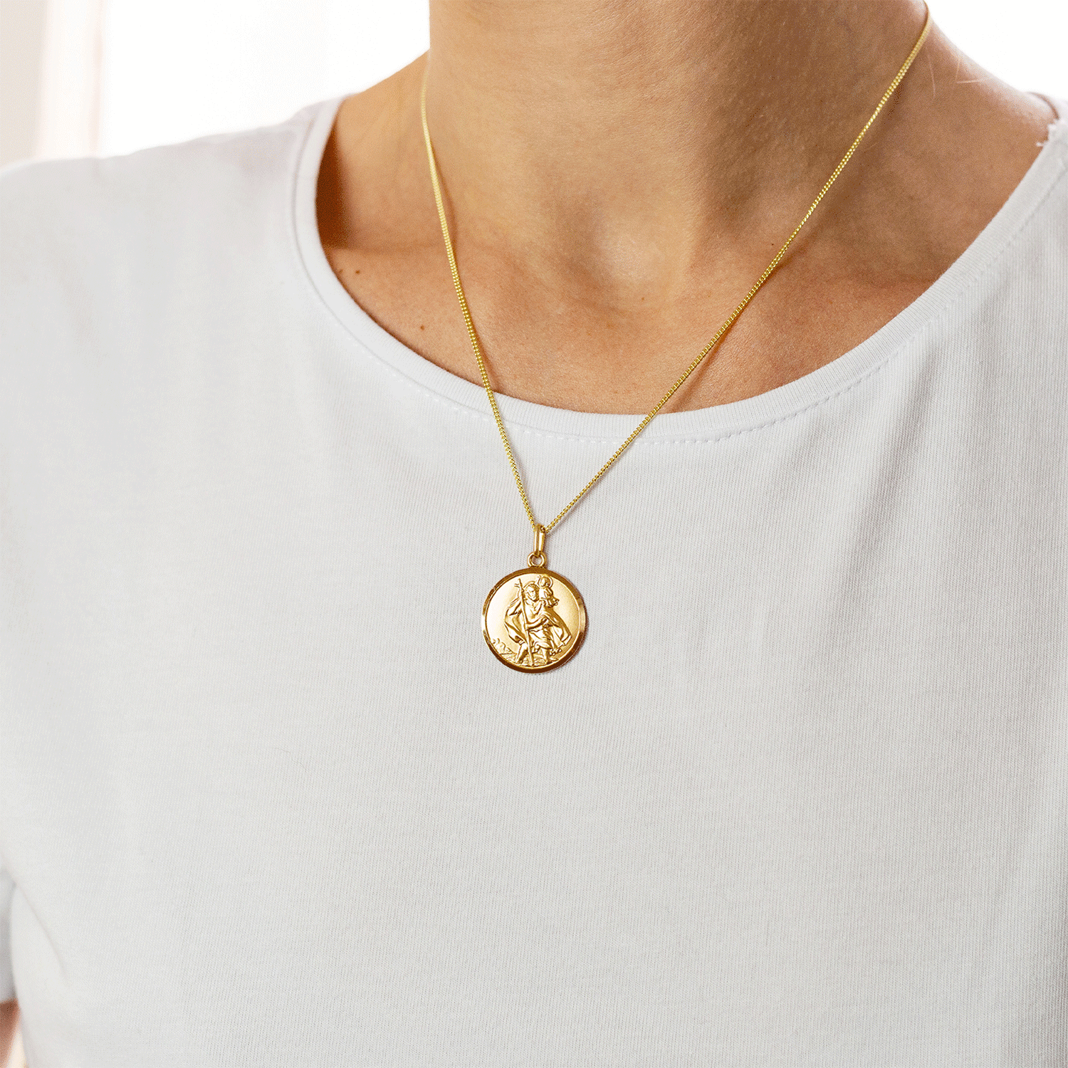 St Christopher, the patron saint of travellers, is depicted on the front of the gold pendant with intricate detail made possible by our precision stamping technique, while the back features a finely polished finish. This serves as a constant reminder of protection and safe journeys, a perfect gift for any adventurer.