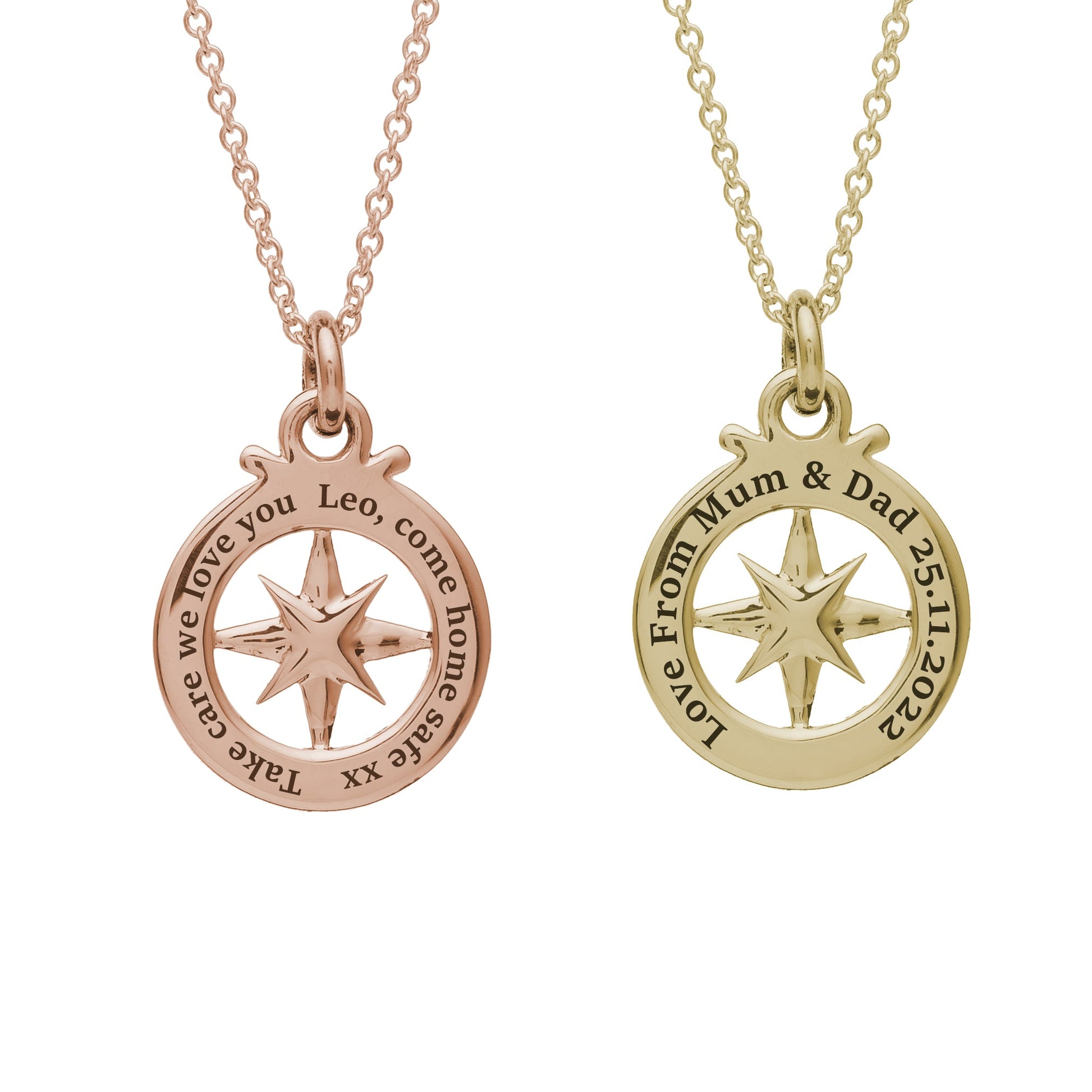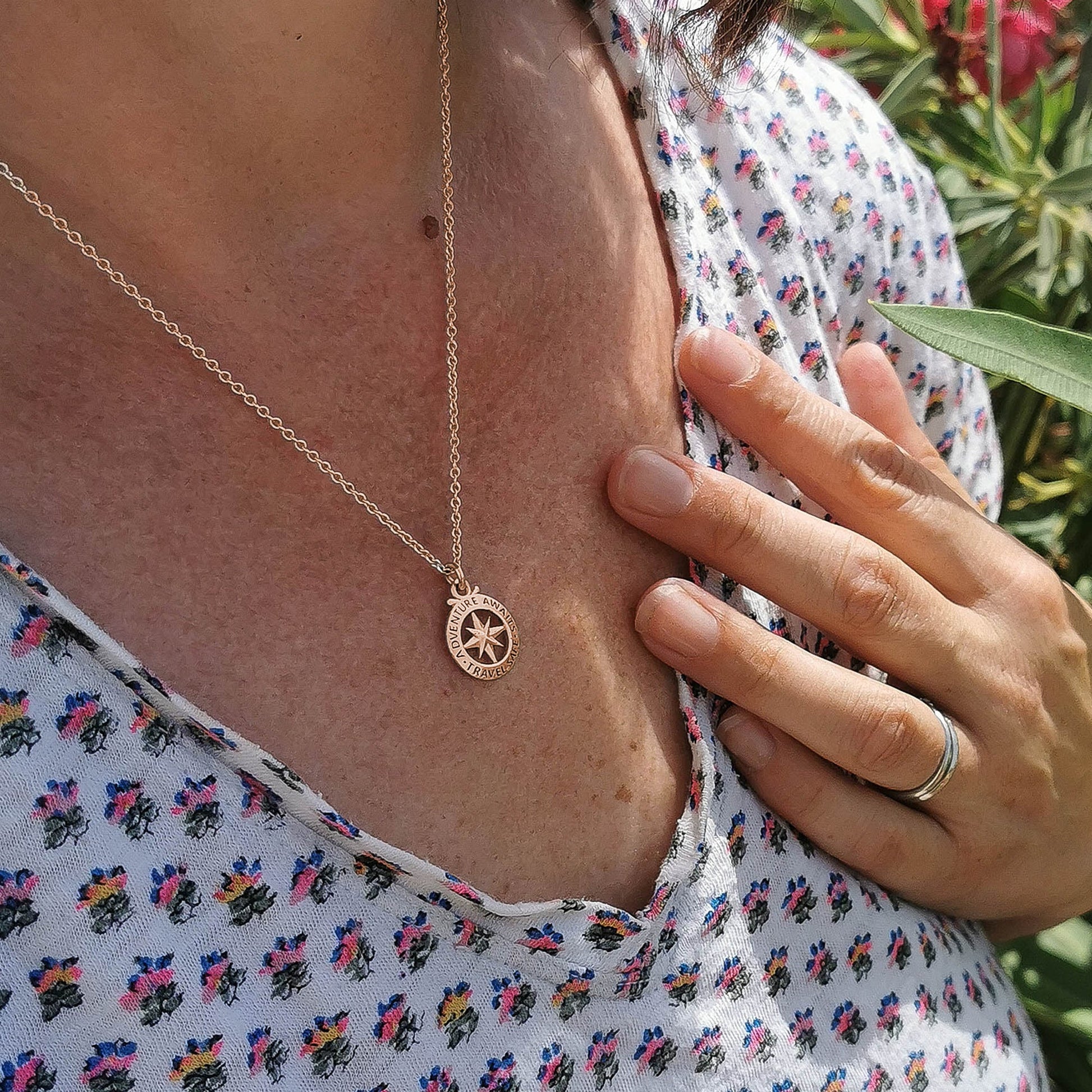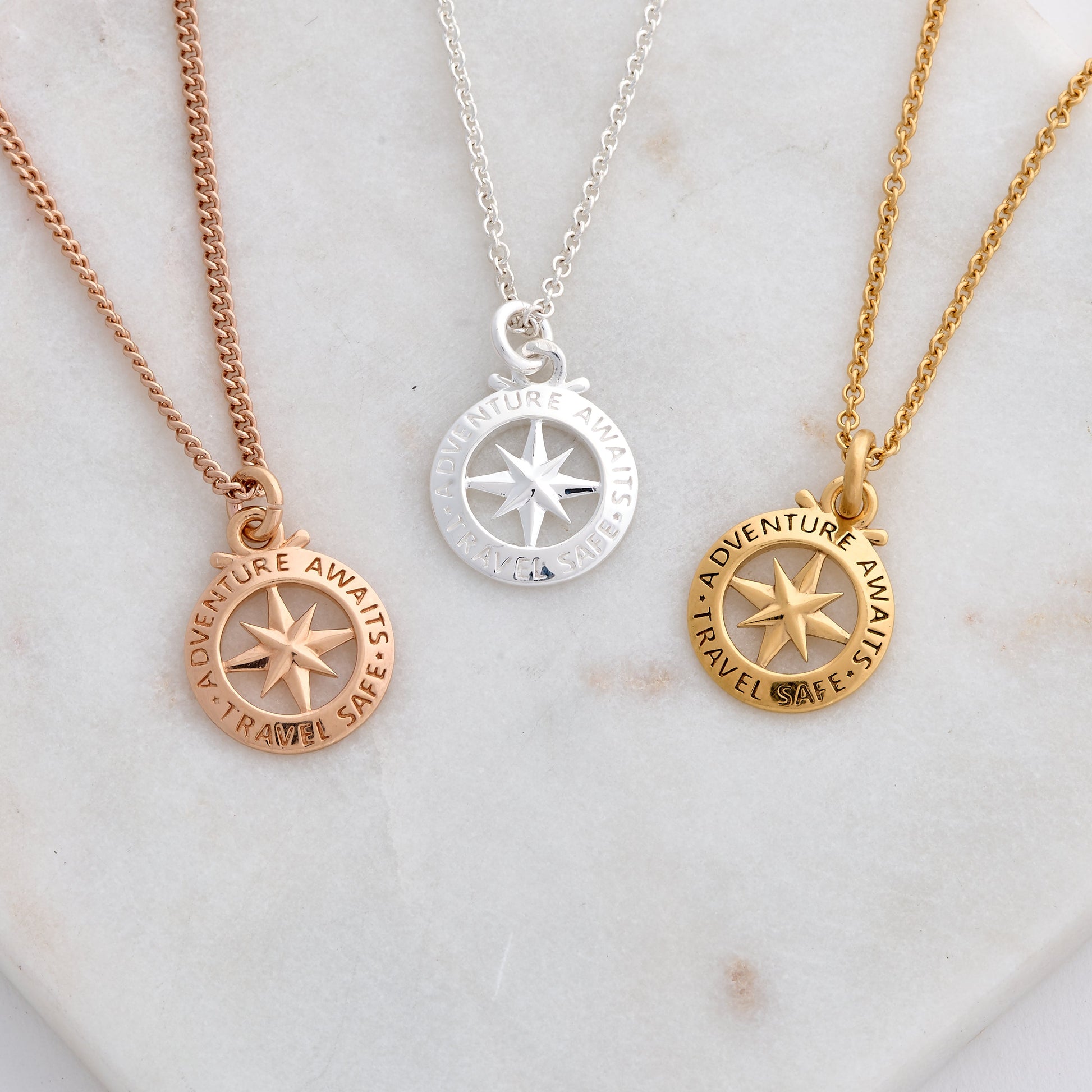 A unique travel safe necklace is the perfect way to remind them to stay safe on their travels. The unique shape and bold compass front makes this pendant stand out, along with positive message on border 'Travel Safe - Adventure Awaits'.