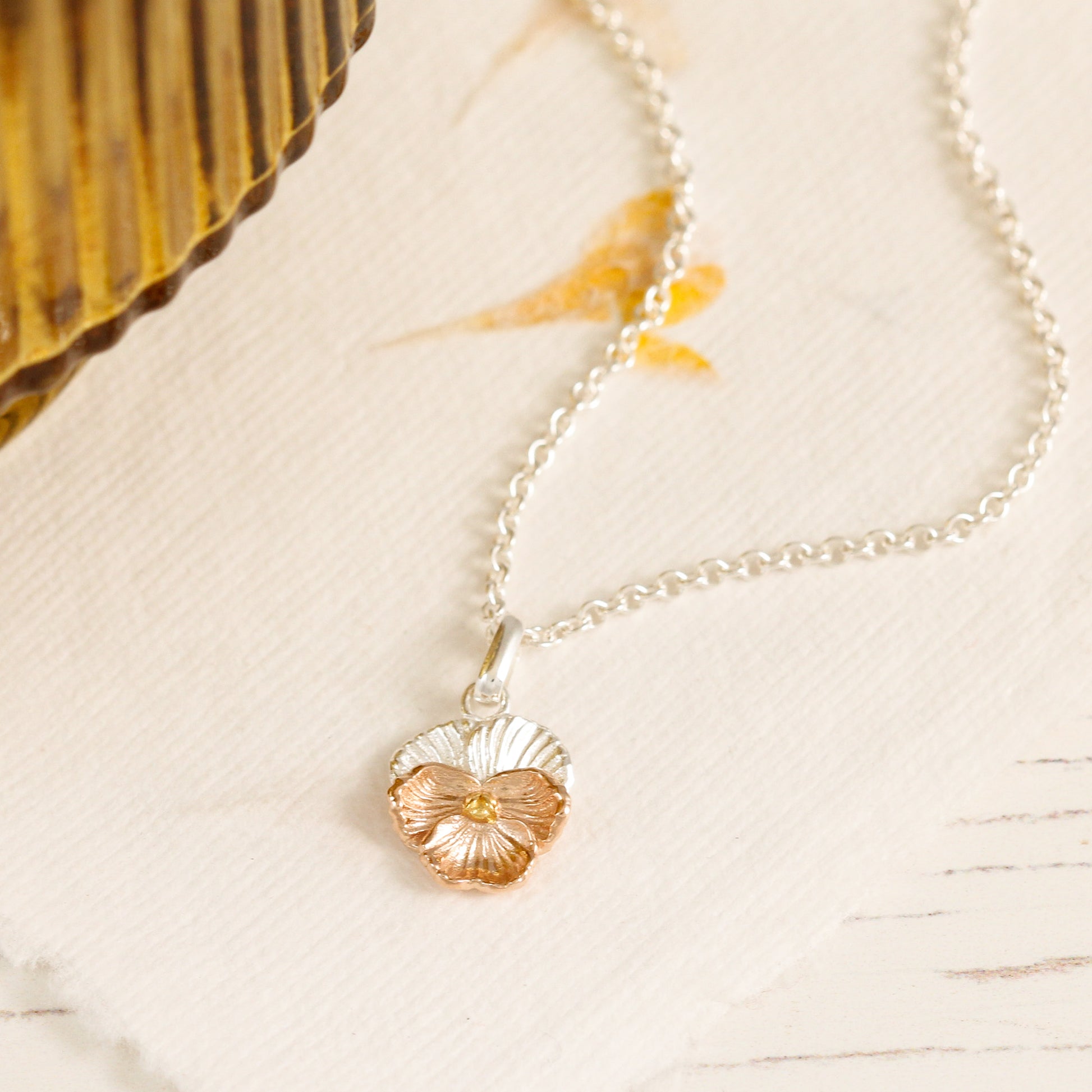 Bring a touch of nature to your wardrobe with our exquisite Violet Flower Silver & Rose Gold Necklace. Inspired by the beauty of the Chelsea Flower Show, this handcrafted necklace features a delicate violet flower in silver and 18ct rose gold vermeil.