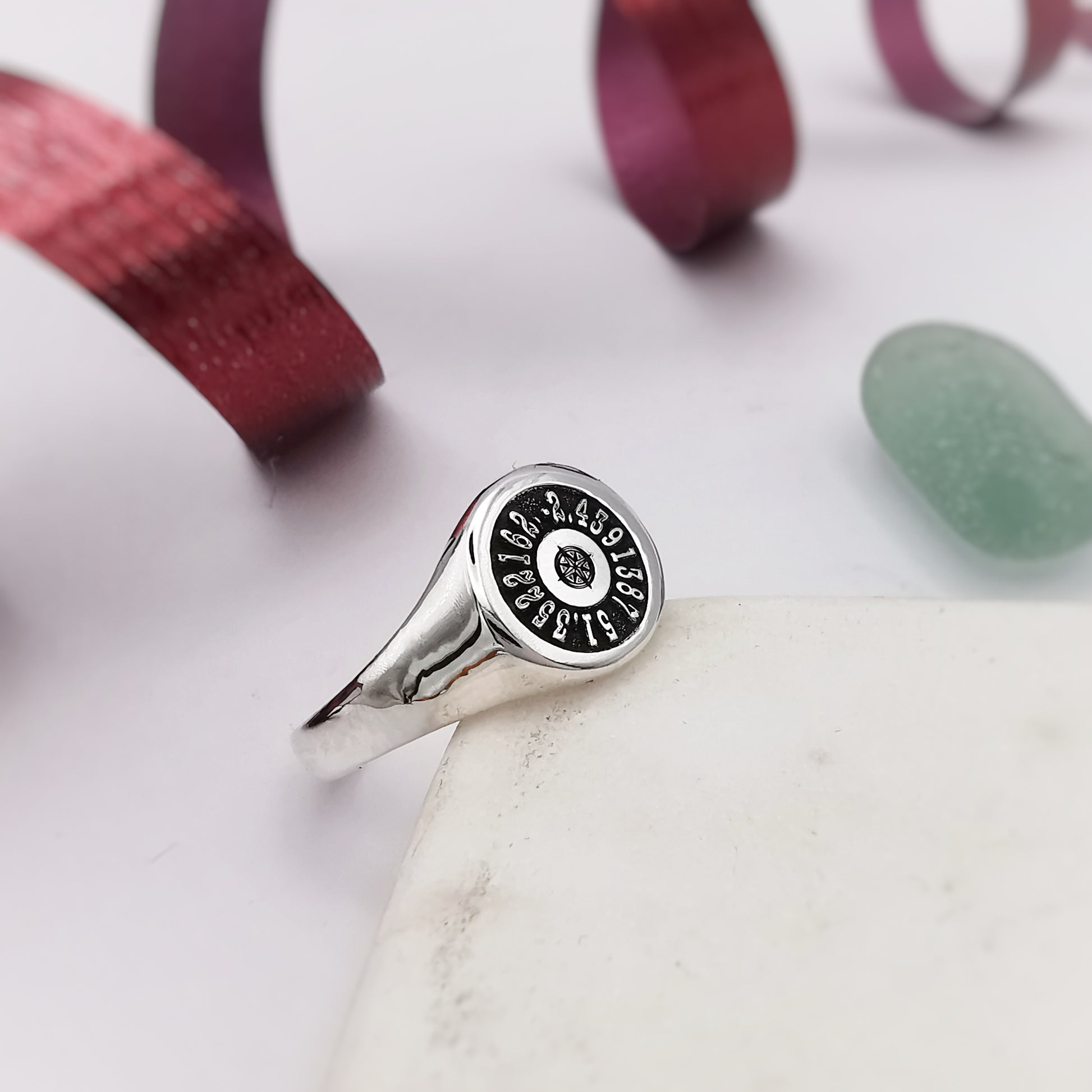 Fabriqué en argent sterling massif poinçonné. Le visage de la bague mesure un peu moins de 10 mm de diamètre, la bande de bague se rétrécit jusqu'à 3 mm de largeur à l'arrière. Le dos de la bague n'est pas creux : il est entièrement en argent massif et poinçonné au Royaume-Uni.