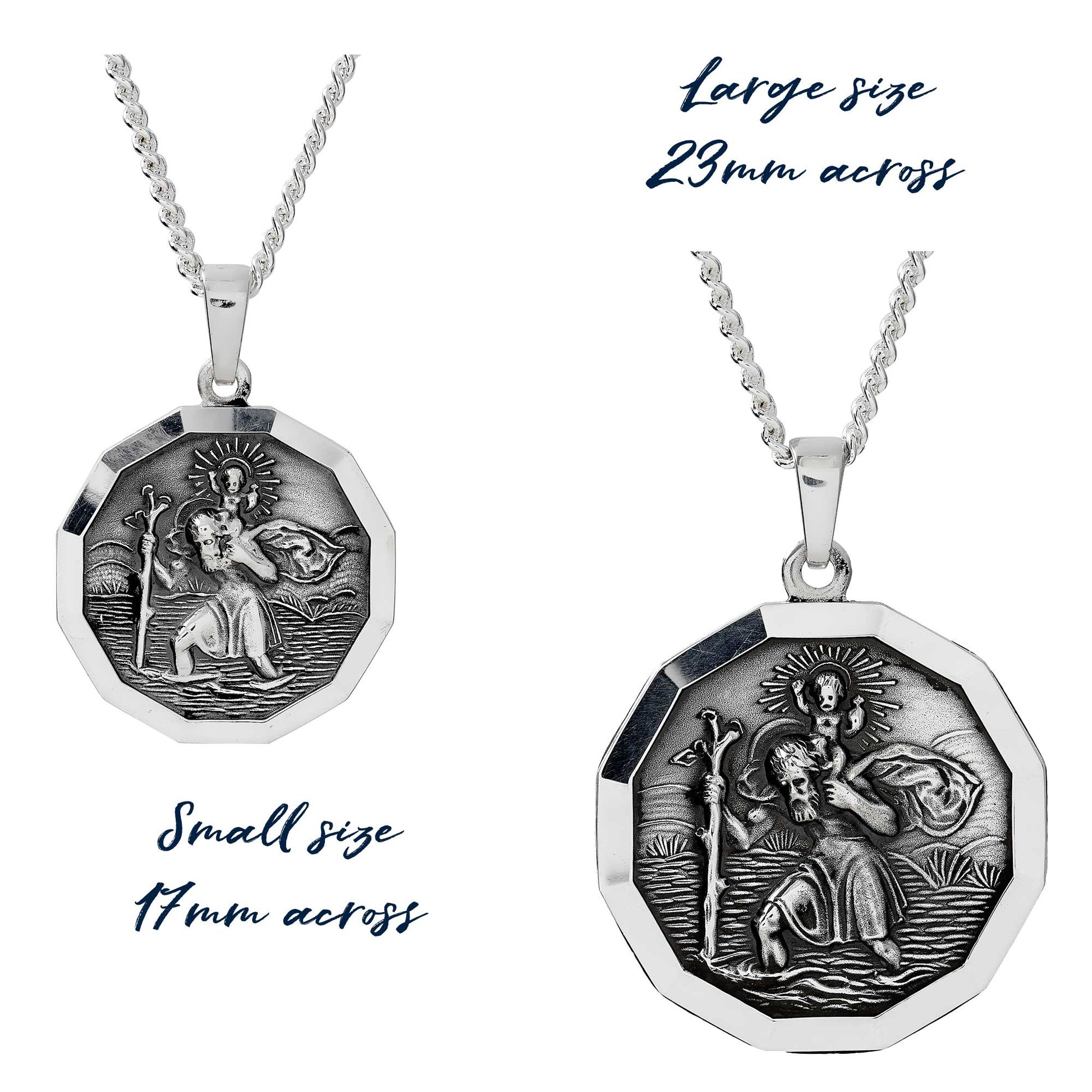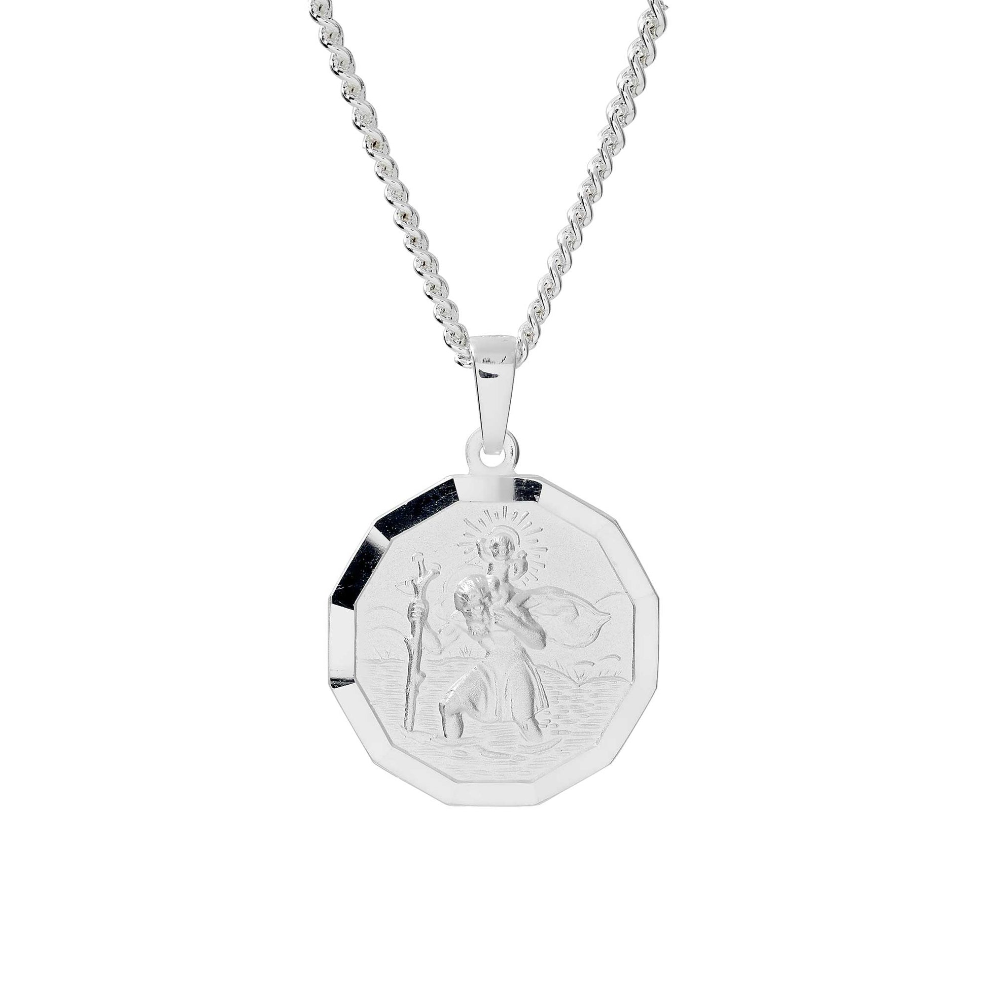 Ce collier en argent personnalisé unique à 12 côtés de Saint Christophe Dodécagone est le moyen idéal pour commémorer un 18e ou 21e anniversaire spécial, ou un voyage.