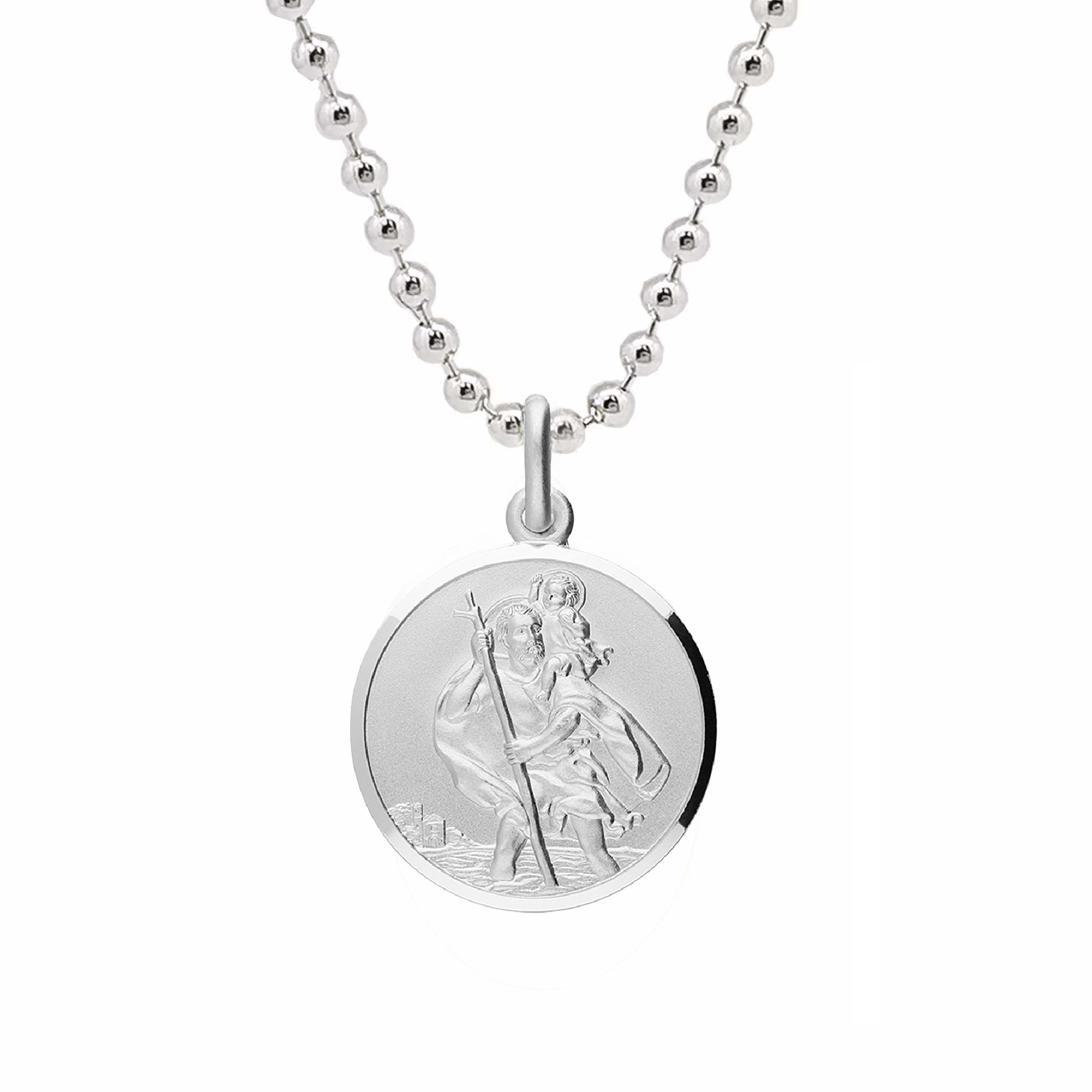 Saint Christopher is 20mm x 20mm x 2mm thick and has a weight of 4g (without the chain). The silver chains start at 1.1mm wide and available in a selection of lengths.