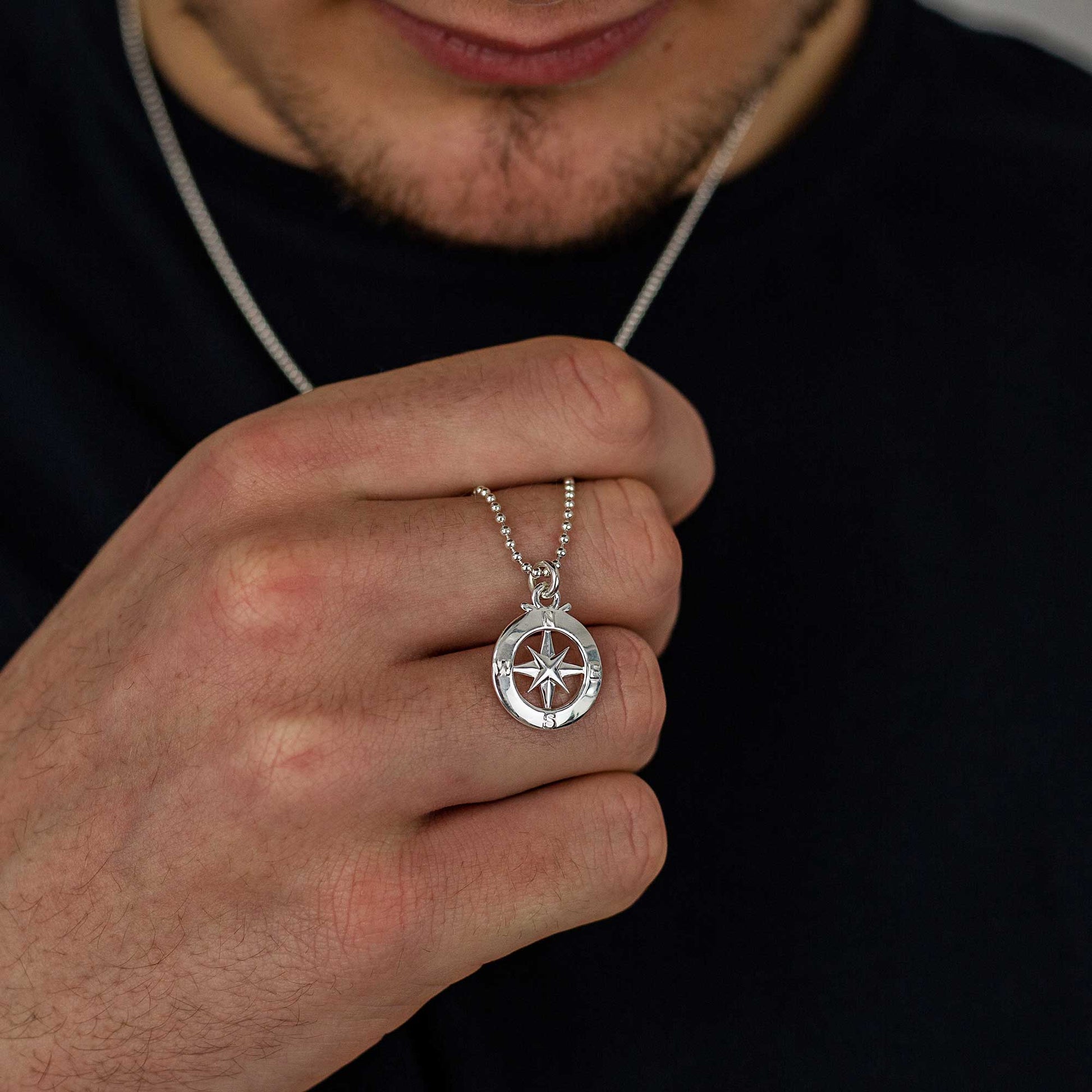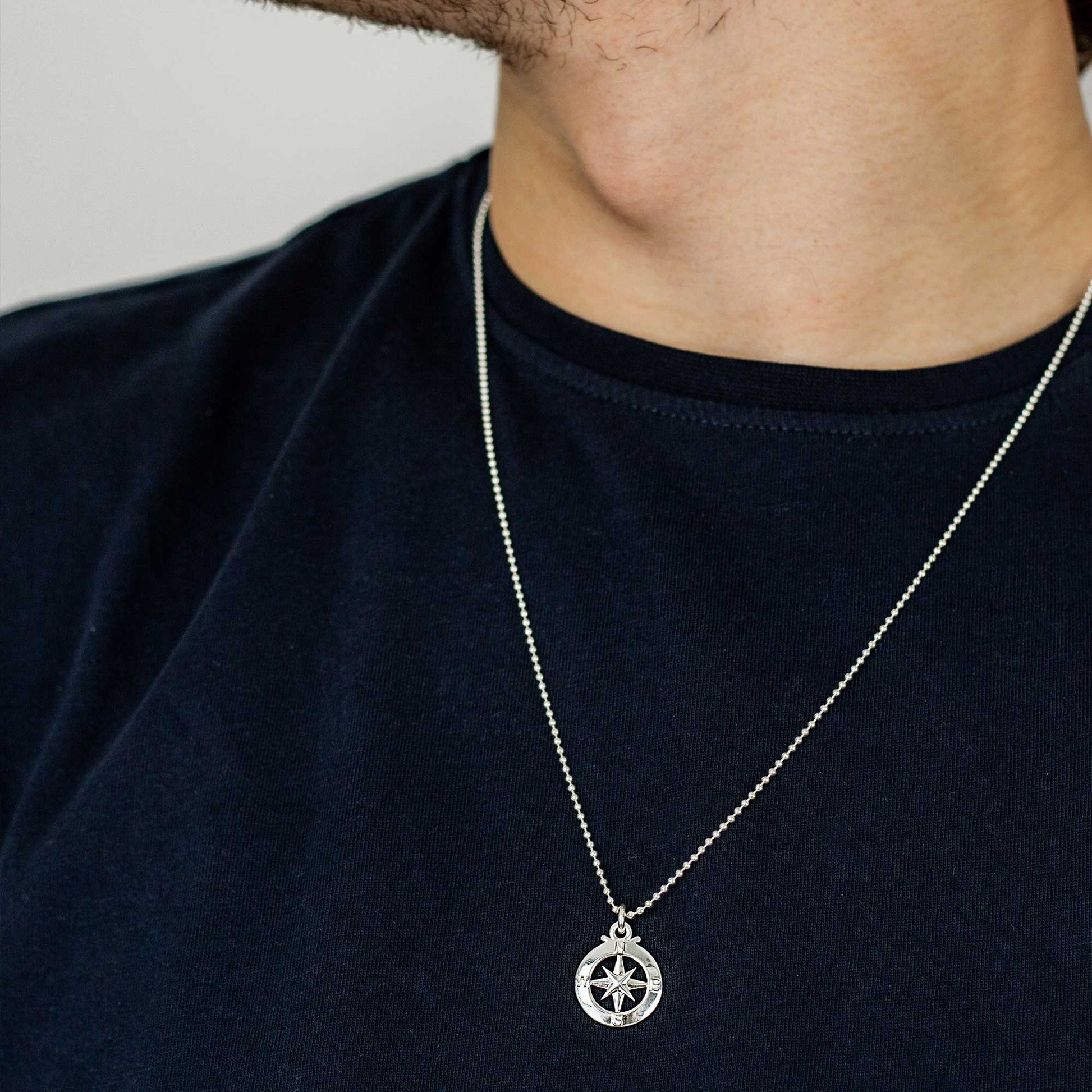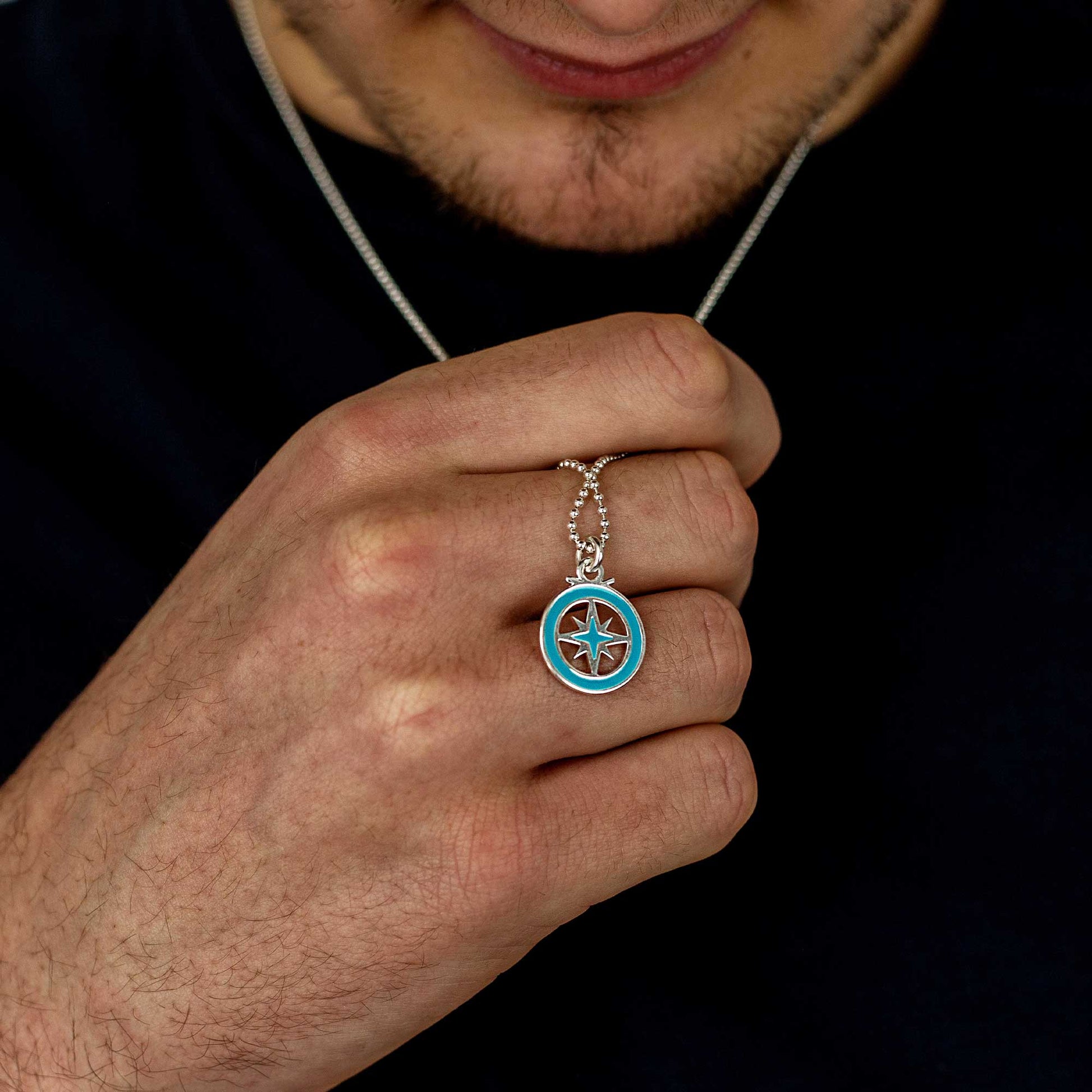 This is the smaller (standard size) of our two outline enamel compass necklaces, perfect as a subtle men's pendant or travel necklace for a woman.