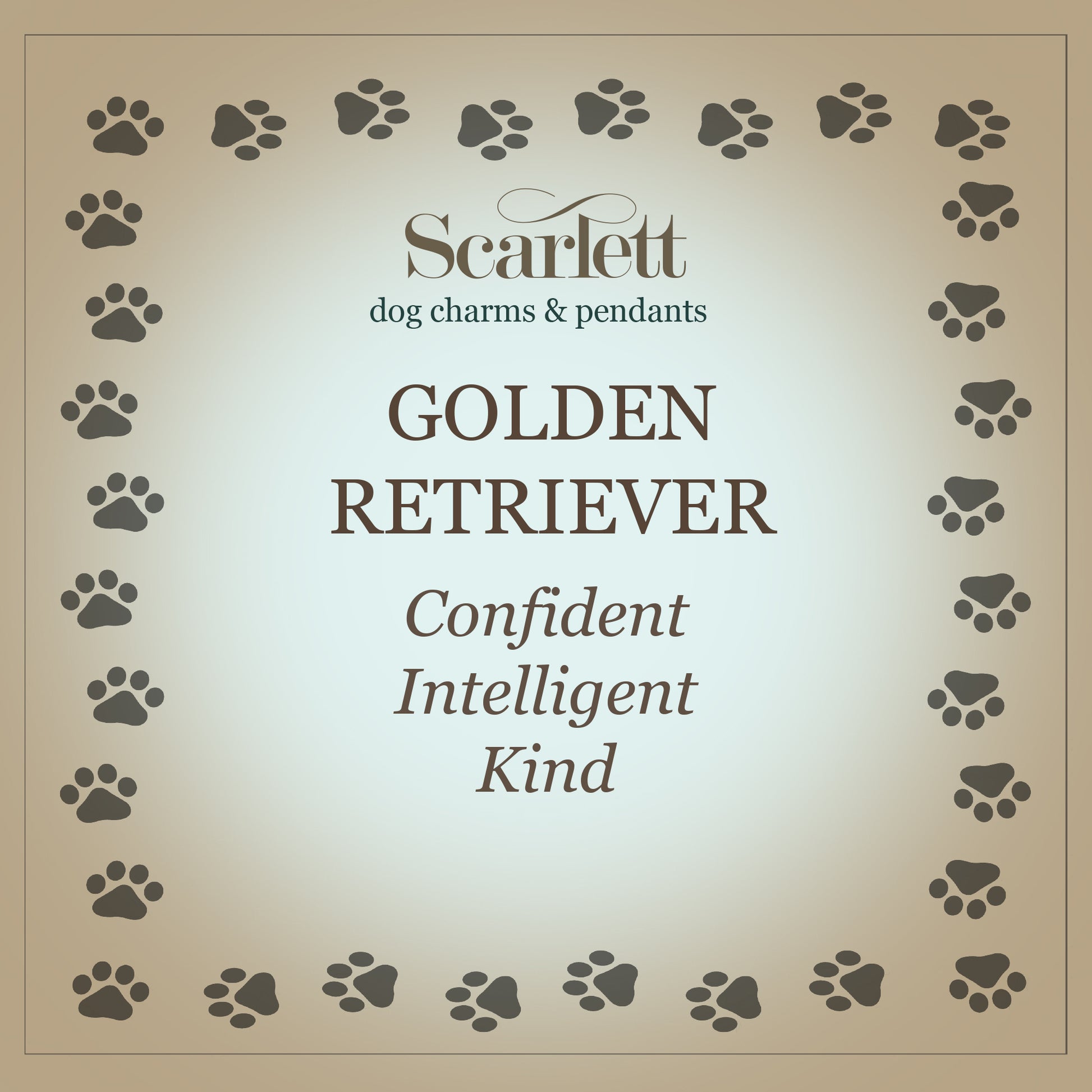 A dainty, miniature, yet true to life silver Golden Retriever charm with a unique personality, complete with a wide smiling face ready to love, and bushy tail, finished with a tiny dog tag engraved with doggie's name or initials and a tiny paw print symbol.